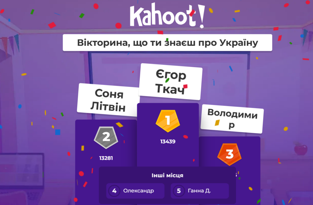 Учні 5–11 класів взяли участь в онлайн-вікторині «Що ти знаєш про Україну?», яка сприяла розширенню знань про історію, культуру, символи та традиції нашої держави. Найкращі результати показали Єгор Ткач (7 клас), Софія Літвін (10-А клас), Володимир Скірко (5 клас).